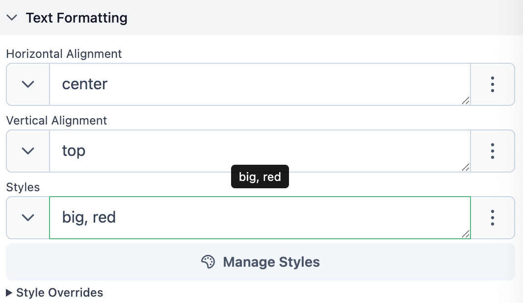 | Wrong color/size showing | Check the inheritance order. The last style that sets a property wins. Reorder styles in the "Inherit From" list. |