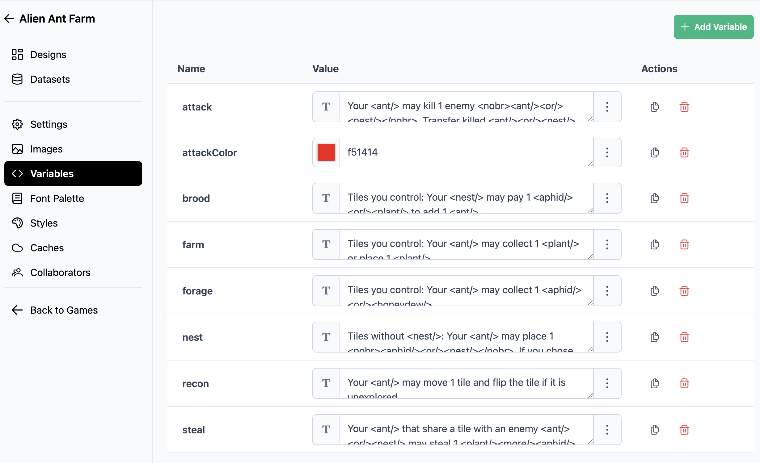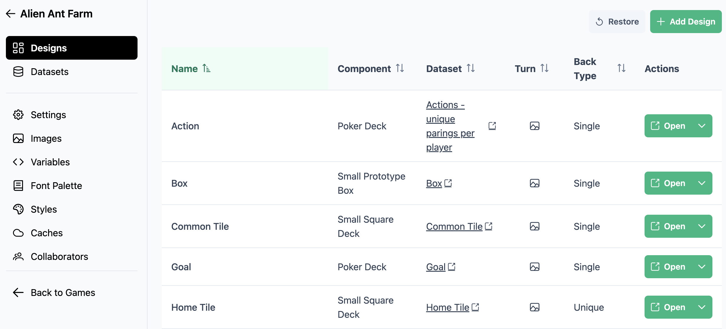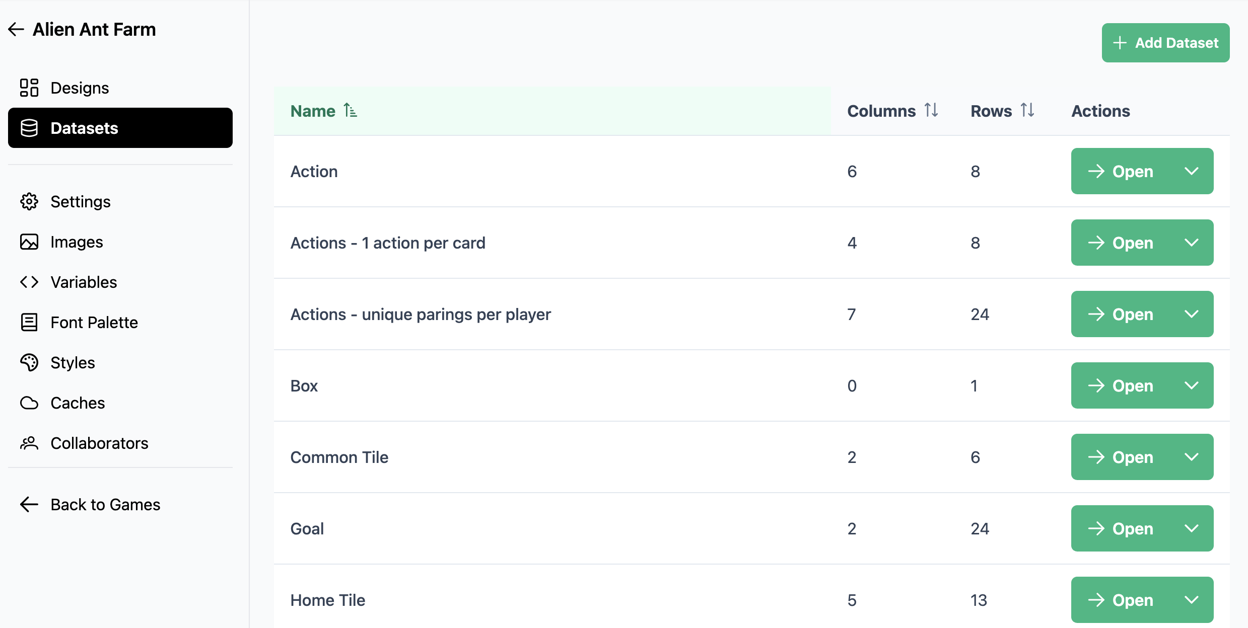Datasets are the data representation of a set of components. Each row in a dataset represents all the data for a single card or tile. Think of these like spreadsheets.