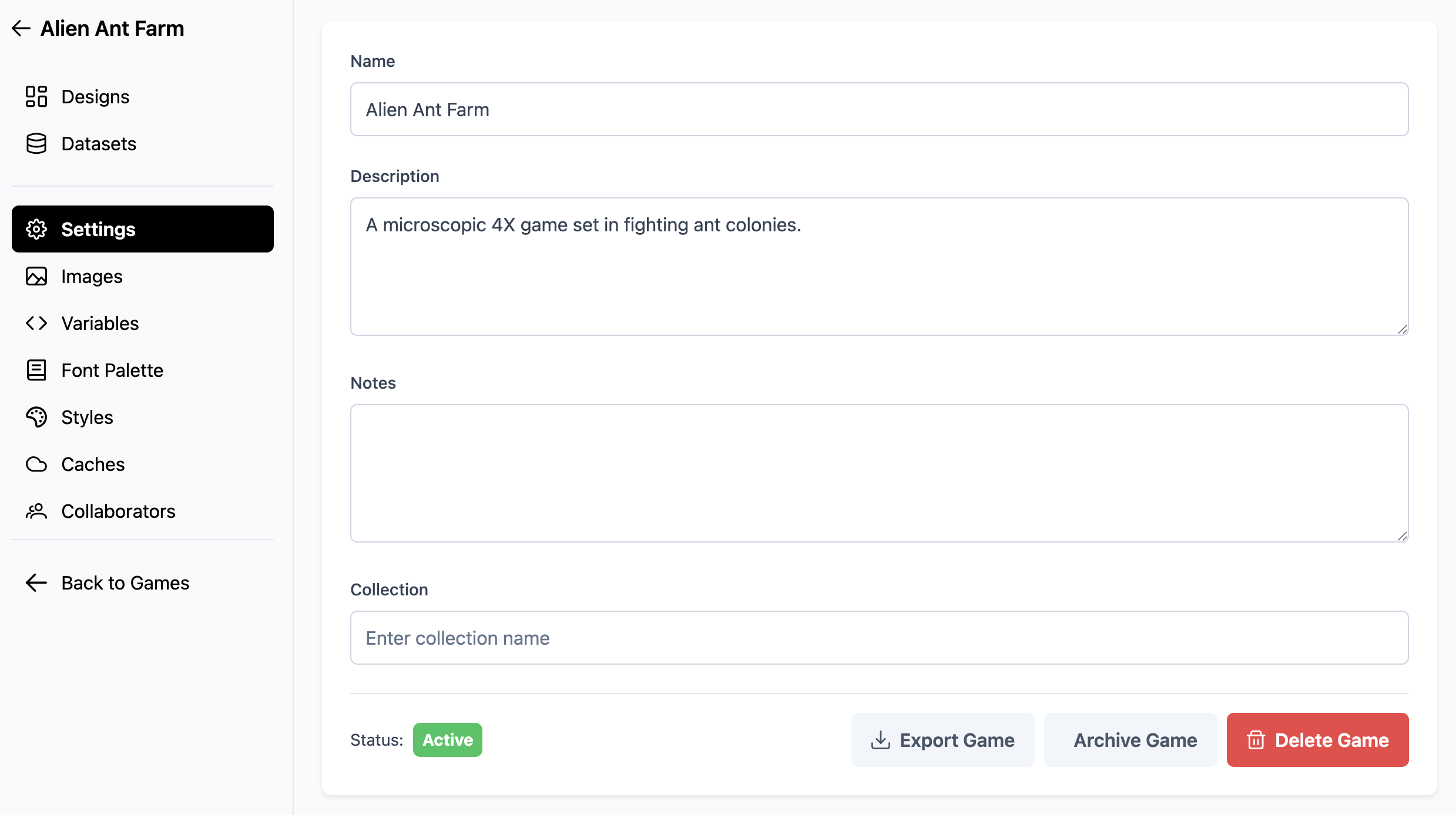 Here you can rename a game, or mark it archived if you're no longer actively working on it. Don't worry, after it's archived you can still access it by filtering to display archived games in the game manager.
