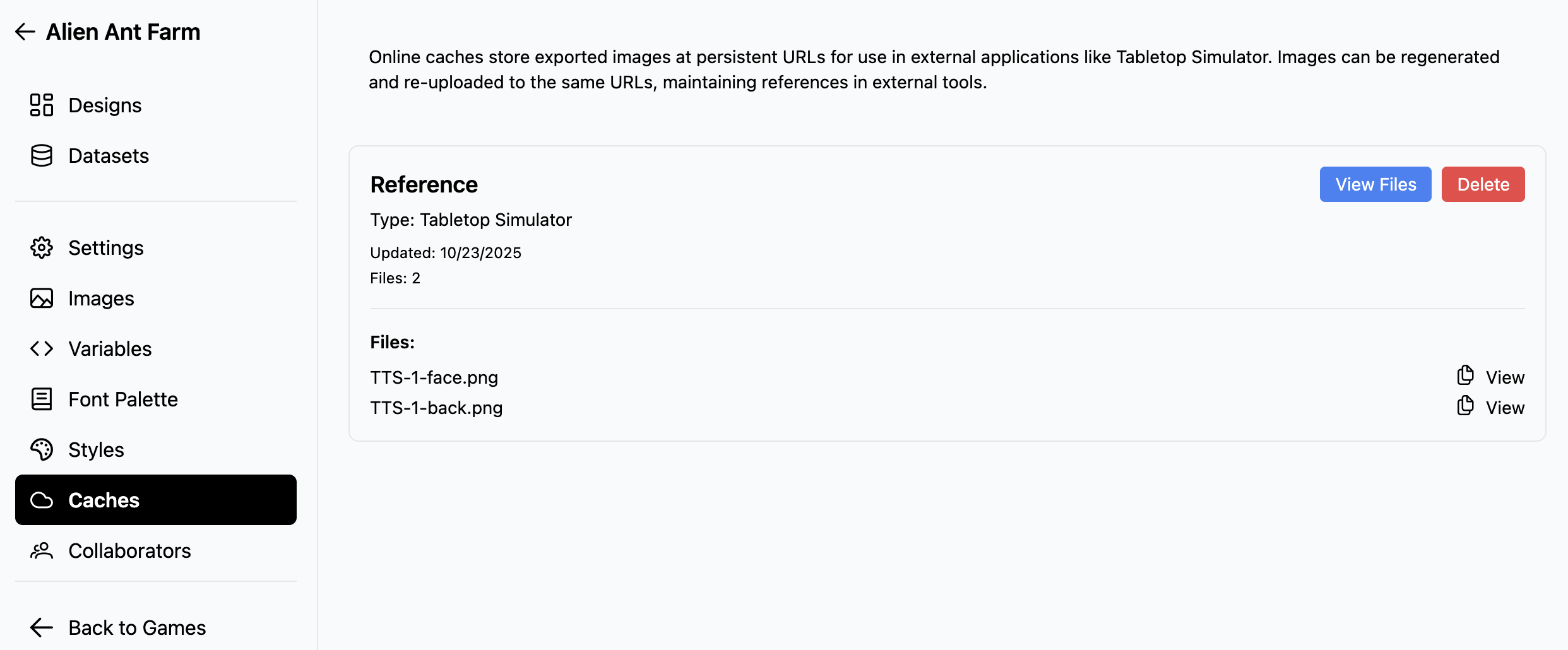 Caches are files generated by Component.Studio on your behalf for things like Tabletop Simulator to use.