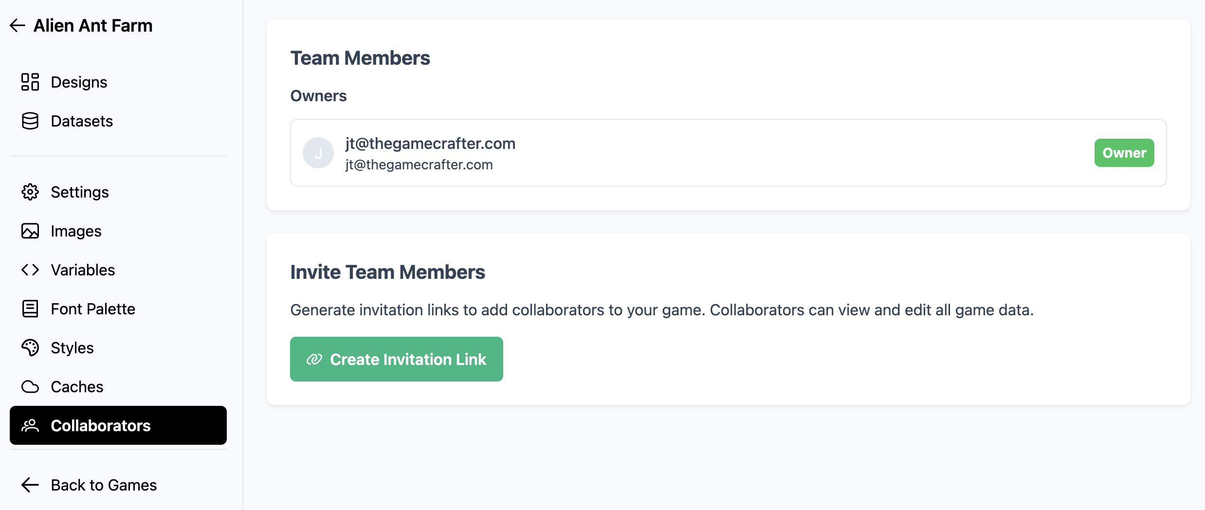 If you want someone else to be able to work on your game with you, you can add them as a collaborator. They have to have an account on the site, and then you can search by name, username, or email address.