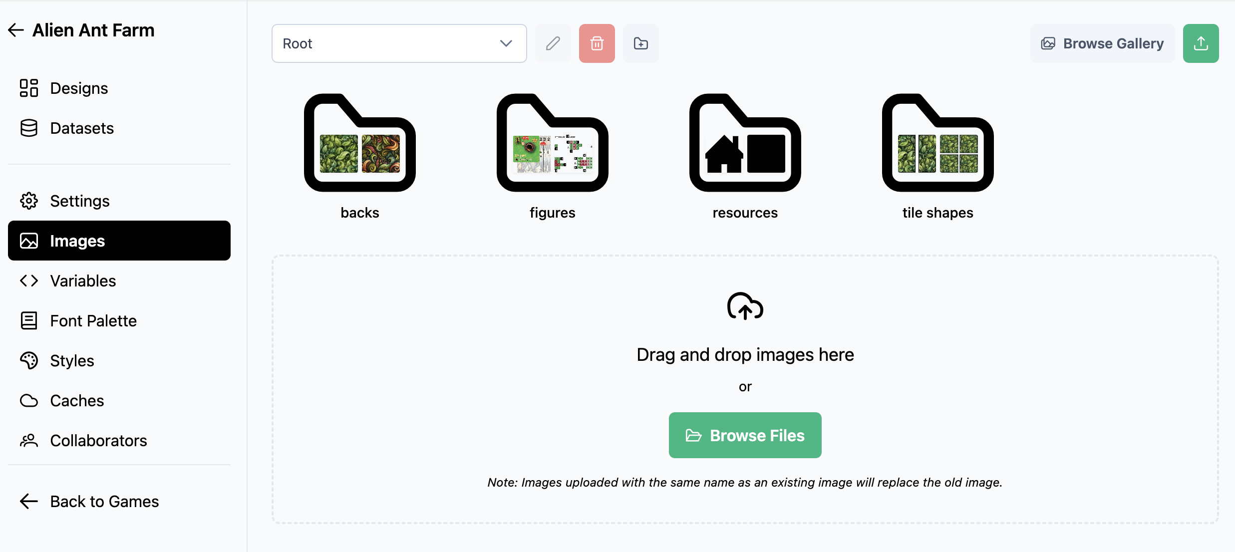 Designs are the visual representation of a set of components, such as cards, tiles, chits, board, mats, etc. Think of this like an image editor.