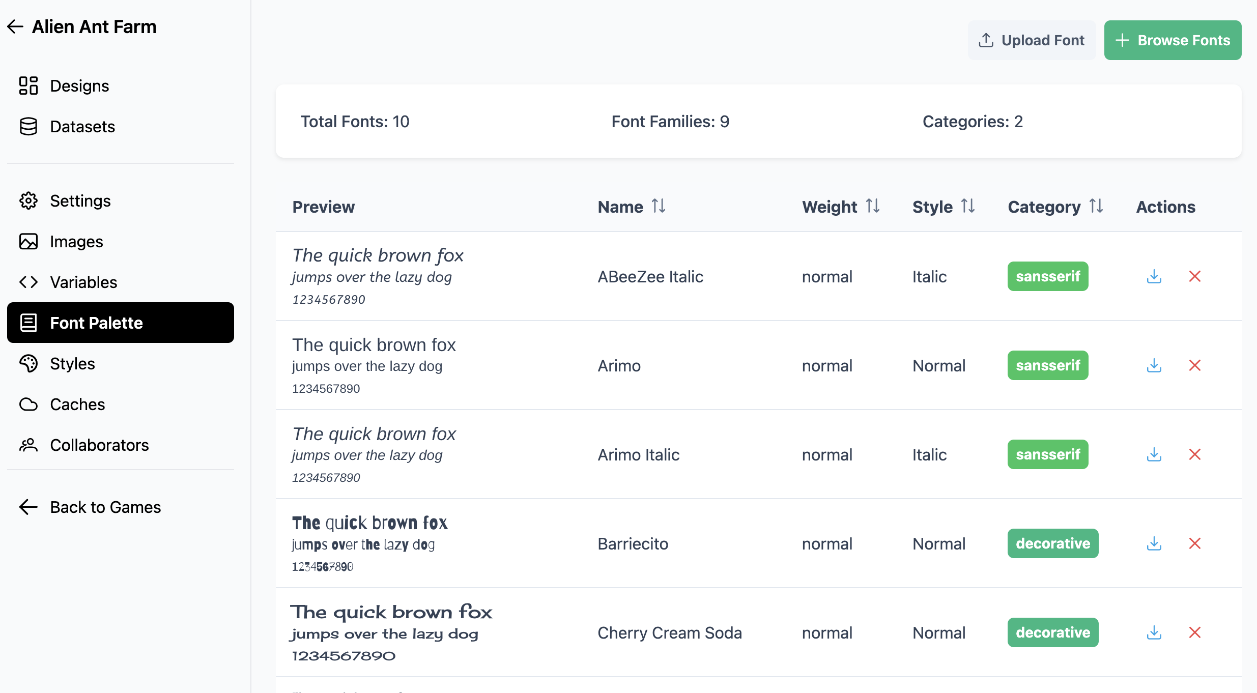 Component.Studio comes with thousands of fonts, and you can upload your own. In order to make that more manageable, the Font Palette allows you to select just a handful of fonts that might be useful to your specific game. By default you'll get these 3, but you can add more by hitting the green add more fonts button.