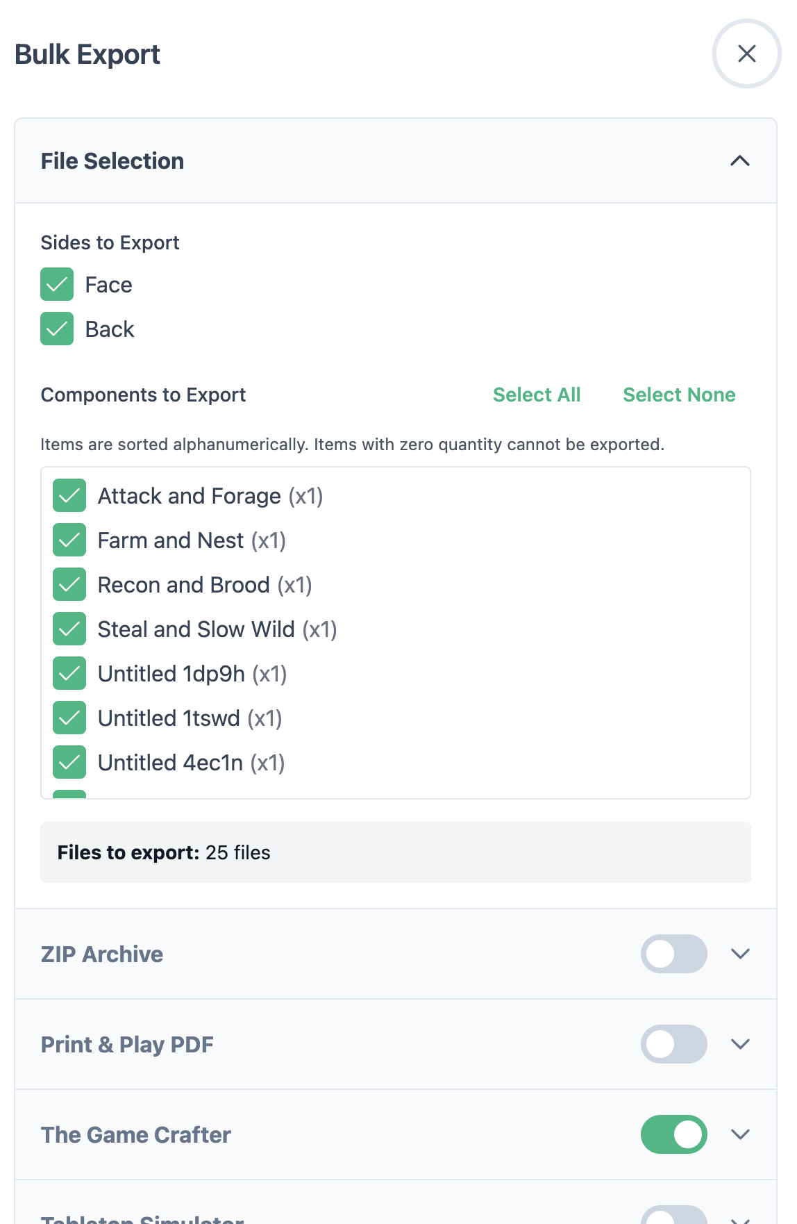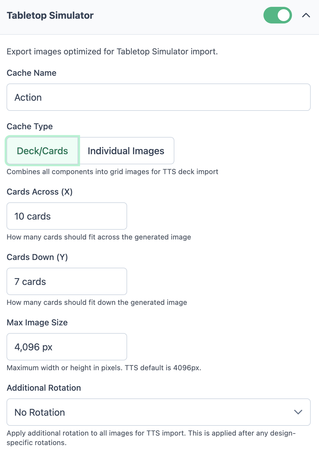 Deck/Cards: Combines all cards into grid images (one for faces, one for backs). Standard for playing cards. Individual Images: Exports each card as a separate image file. Use for odd-shaped or thick components. |