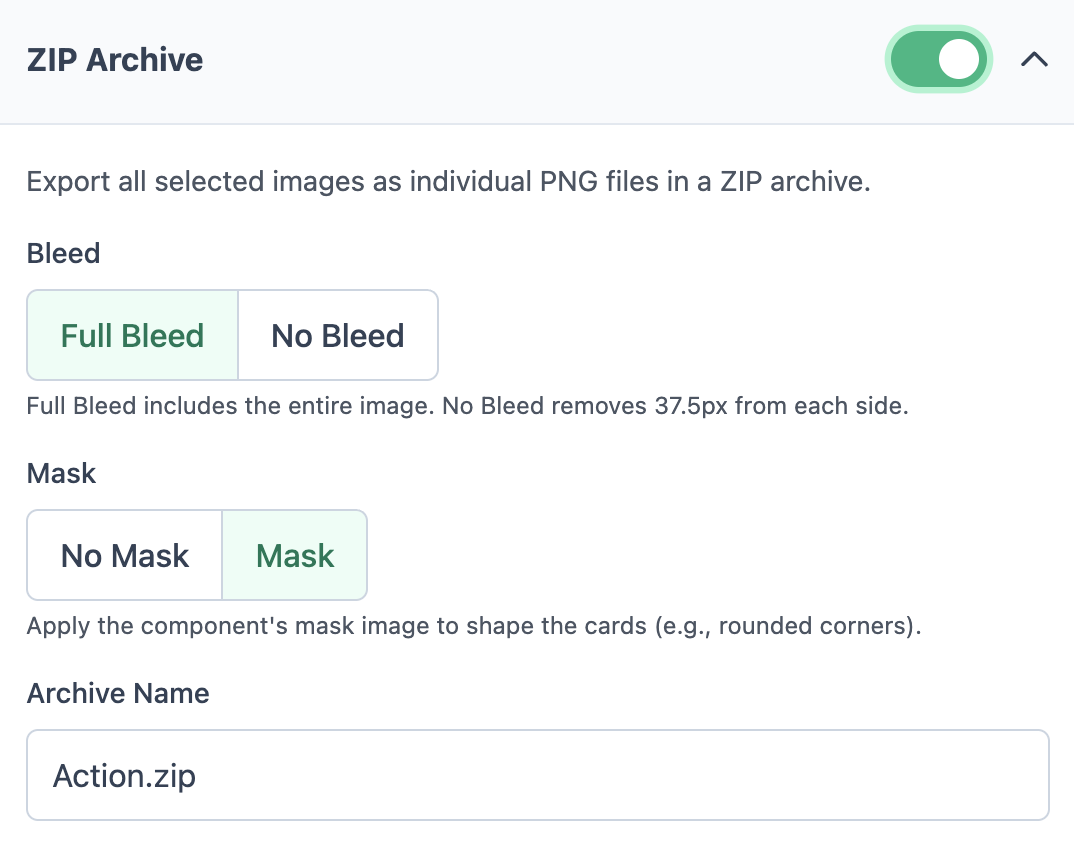 | Archive Name | Text input | Name for the downloaded ZIP file. Defaults to the design name. |