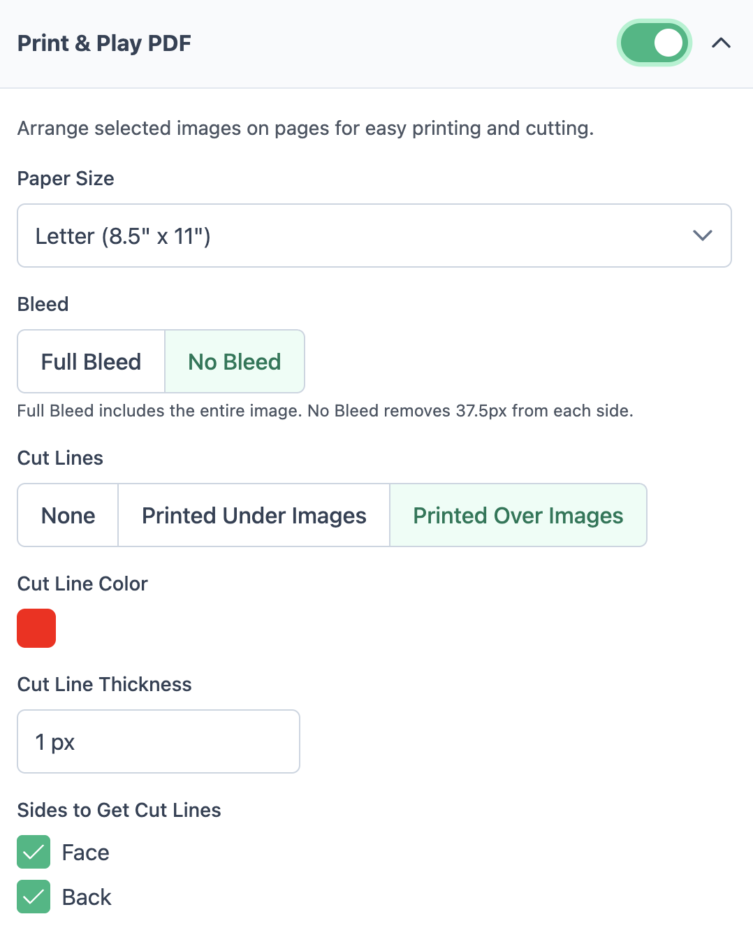 | Rotate Backs 180° | Toggle switch | When enabled, back images are rotated 180 degrees. Useful for duplex printing - print fronts, flip paper on short edge, print backs. |
