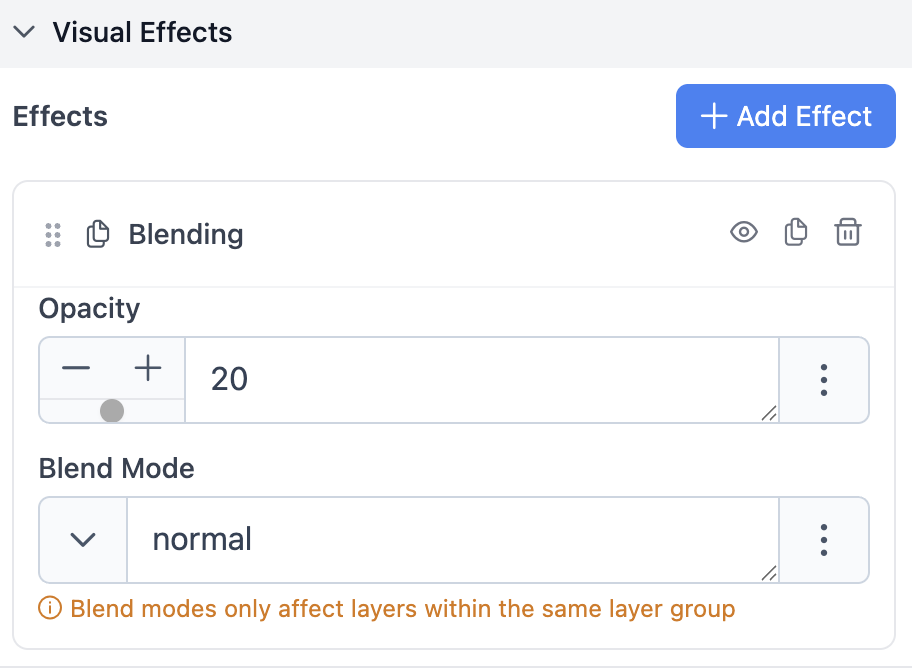 | Effect Order | Effects are applied from top to bottom. Drag to reorder effects in the pipeline. |