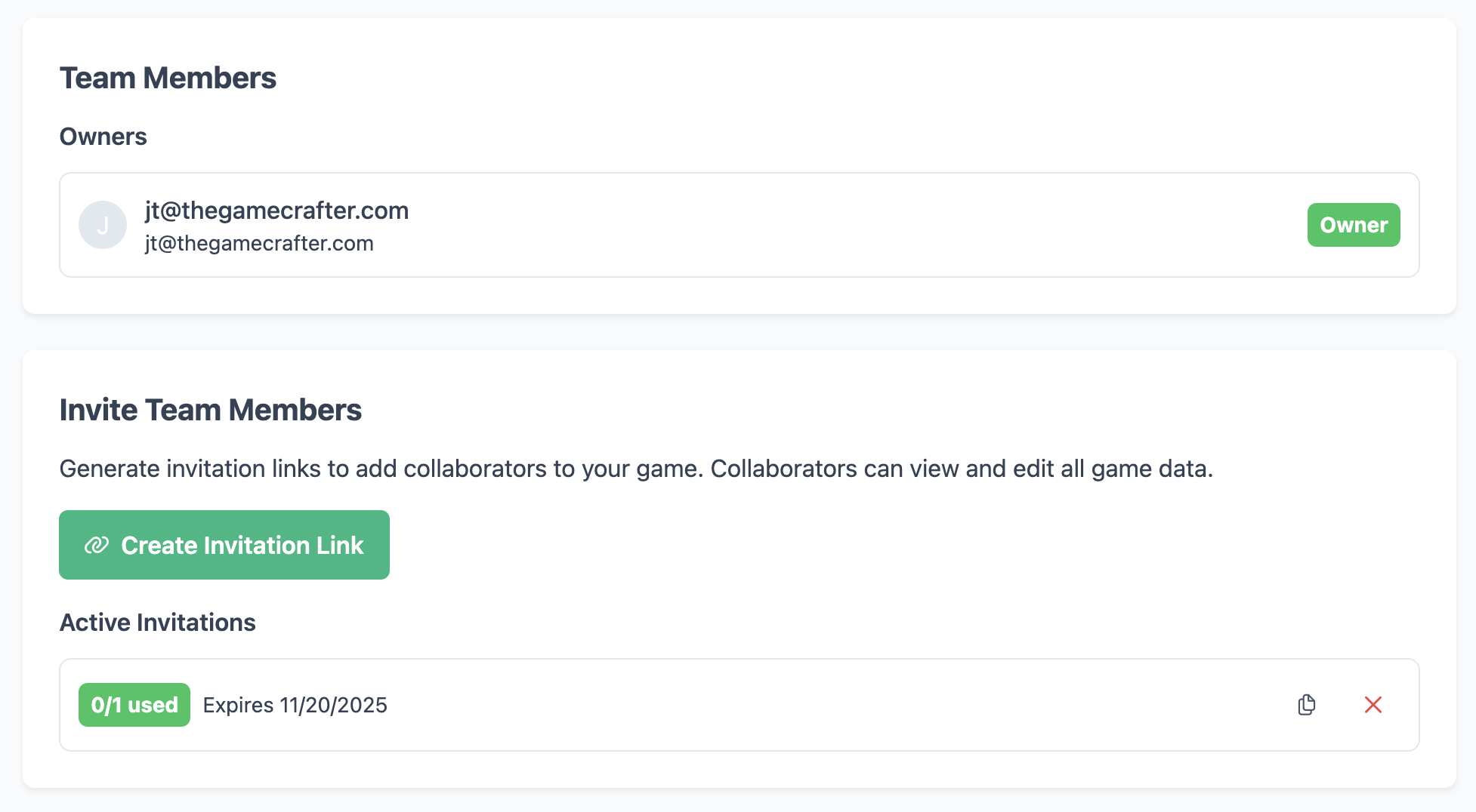 | Can't see the "Invite Team Members" section | You must be a game owner to create invitations. Collaborators don't see this section. |