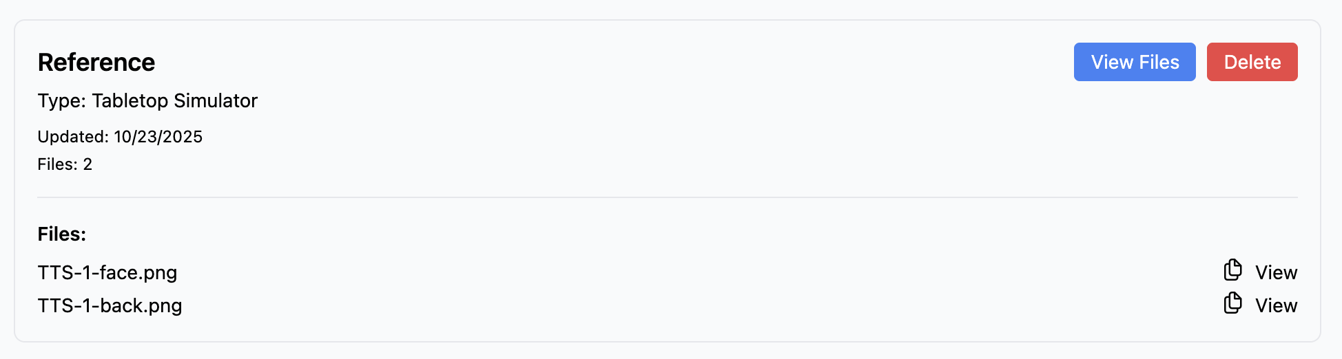 Click the copy icon next to any file to copy its URL. Paste this URL into Tabletop Simulator's image URL field to load the image.