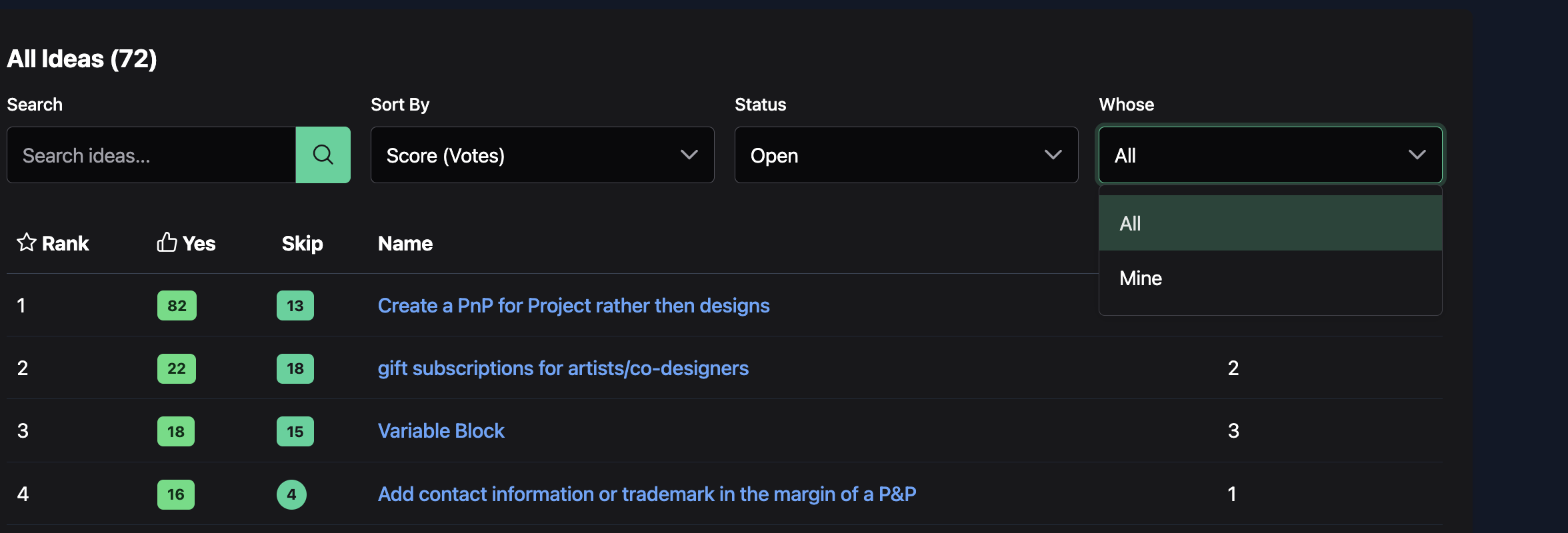 Before submitting an idea, you will want to search Ideas to see if the suggestion has already been submitted. You can do this by scrolling down to All Ideas. You can type in keywords to search.